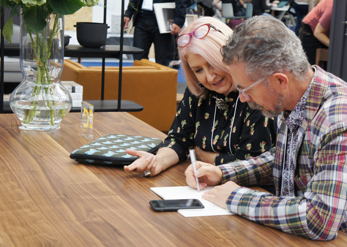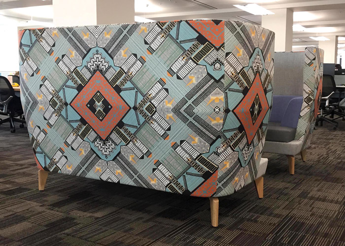 When I bumped into friends of Design Insider, the Patternistas, I couldn’t help asking them about their recently completed workplace project. The Cardiff based creative duo had collaborated with the strategic team of a global corporate accountancy business to create four bespoke patterned fabrics for two of their London buildings. The Patternistas’ maximalist patterns were made into contract specification upholstery fabrics by BCFA member Panaz.