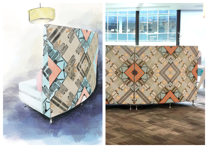 CC: I really enjoyed the openness of the client and that they really wanted us to push how big and bold and lively we could be. The scale was quite large because the patterns were designed to cover large areas on large units, including high-backed sofas and pods.