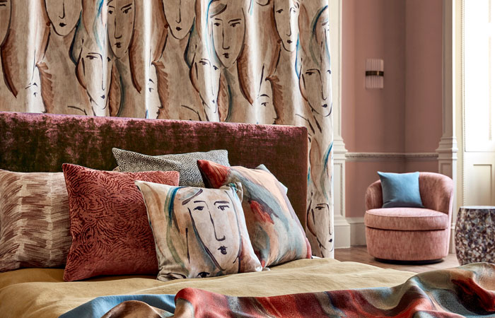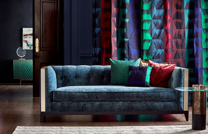 Zoffany Icons: Curtains: Rakugaki 333012 Sofa: Veda 131708 Cushions (L-R): Rakugaki 333012, Zephyr 333044, Zephyr 333053