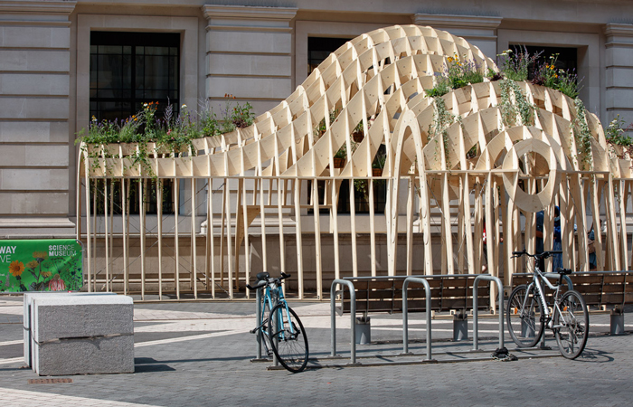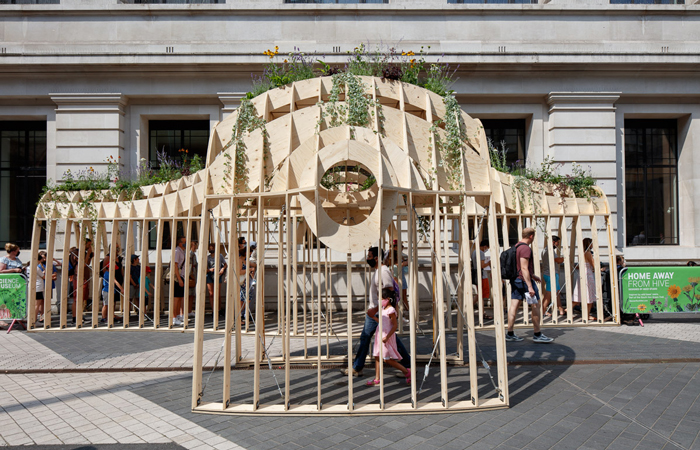 Promoting planting for pollinators is a central feature of the entire trail; something that Home away from Hive by Mizzi Studio is a champion of. Located outside the Science Museum, the installation consists of a large intersecting lattice of timber that forms a hive-like form, into which is an array of medicinal and pollinating plants. As John Tweddle, Head of the Angela Marmont Centre for Biodiversity at the Natural History Museum points out: