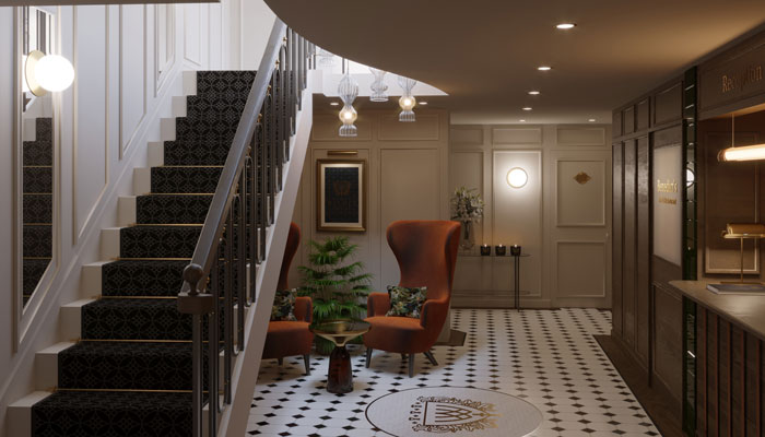 Upon arrival, the lobby’s bespoke new Victorian-style mosaic floor tiles feature the new hotel branding inset at their centre. The concierge area features horse-racing details to the timber reception desk design, including leather straps and branded leather tabs for the room keys. The main stair at the rear has been finished in a bespoke carpet, with dark edging detail and an ornate banister. A seating arrangement, with velvet chairs immediately suggesting the scheme’s opulence, sits directly beneath the stair, whilst a door leading away from reception takes visitors directly into Benedict’s bar and restaurant.