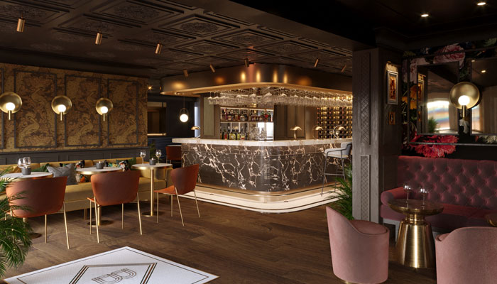 The 45-person-capacity Benedict’s bar features a rich colour scheme of golds and deep tones, with a design influence taken from horse racing. An opulent gold-coloured bulkhead over the bar, for example, is structured to imitate the form of racetracks, whilst feature tiling wraps around the bar itself, which is edged with gold detailing before it cedes to the main dark timber floor. The bar has a dark marble front and a lighter marble top with WILDES branding etched into its front face. A bespoke wallpaper, developed with a specialist designer, includes subtle horse-riding illustrations. Furniture is rich and luxurious, upholstered in velvet and leather, with quilted detailing throughout.