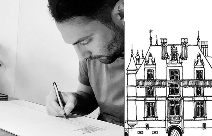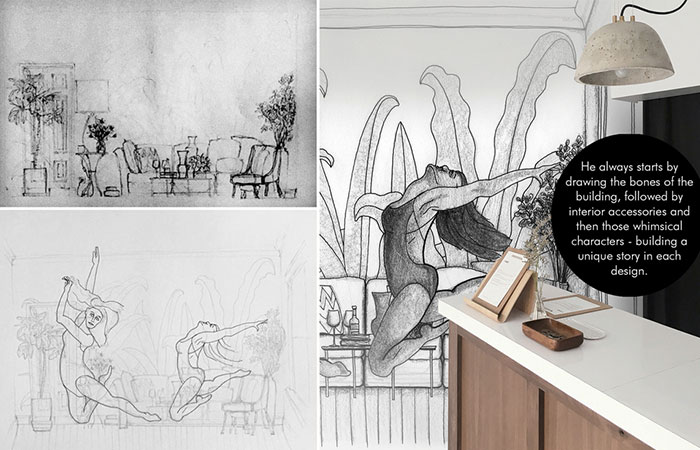 He always starts by drawing the bones of the building, followed by interior accessories and playful characters – building a unique story in each design. Each design has a sense of escapism and can be linked to Ashley’s personal interest in art therapy and the benefits of drawing.