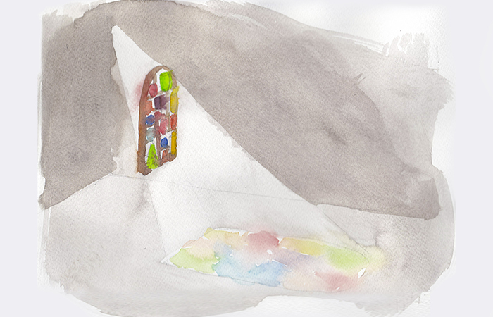 A centerpiece of the exhibition is a stained glass window, designed by Glithero, for the room of perfumers who draw inspiration from historic formulas. The window, depicting perfume bottles through the ages, creates a flood of coloured light that travels through space by day and occasionally brushes over the vessels of scent.