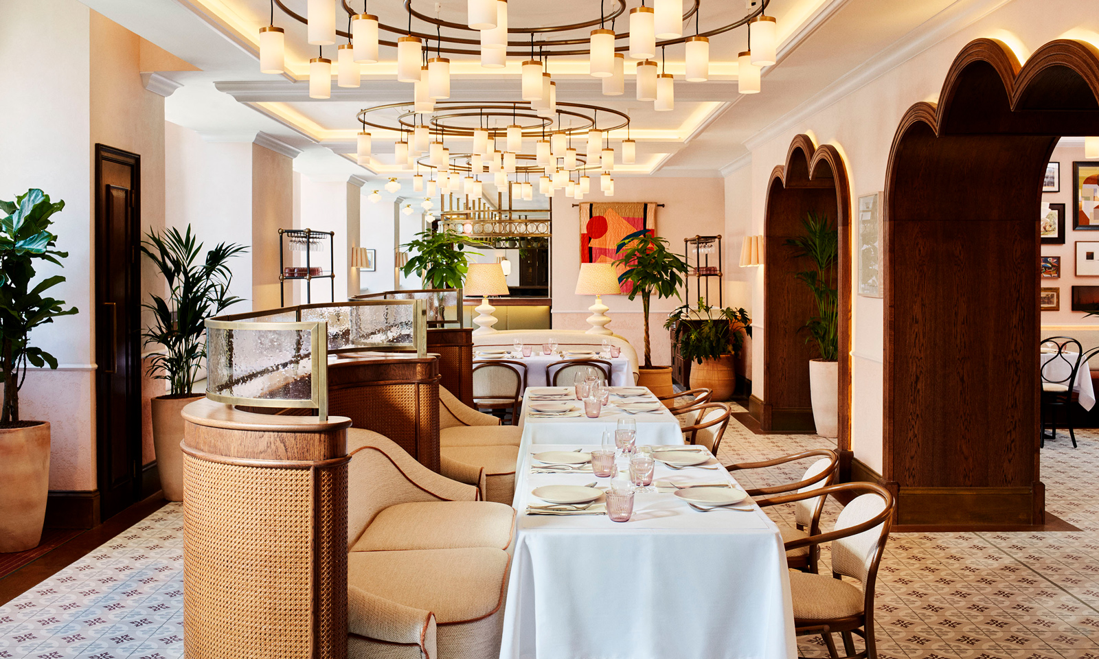Leydi was conceived as a unique restaurant destination independent of the hotel, with its own street entrance. Informed by Istanbul architecture, Leydi features dramatic design flourishes including arched passages, pendant lighting and extensive planting. In response to Ennismore’s brief to create an experience that celebrates food and encourages guest and kitchen connection, the open kitchen adds a sense of theatre and activates the space. The walls give warmth with gradient texture, a bespoke blush plaster finish, and an eclectic artwork collection. Further texture is achieved through rattan features across banquette seating, the wine display, and wait stations. Bespoke lighting includes a statement chandelier – a modern take on a traditional chandelier as a nod to the hotel’s history.