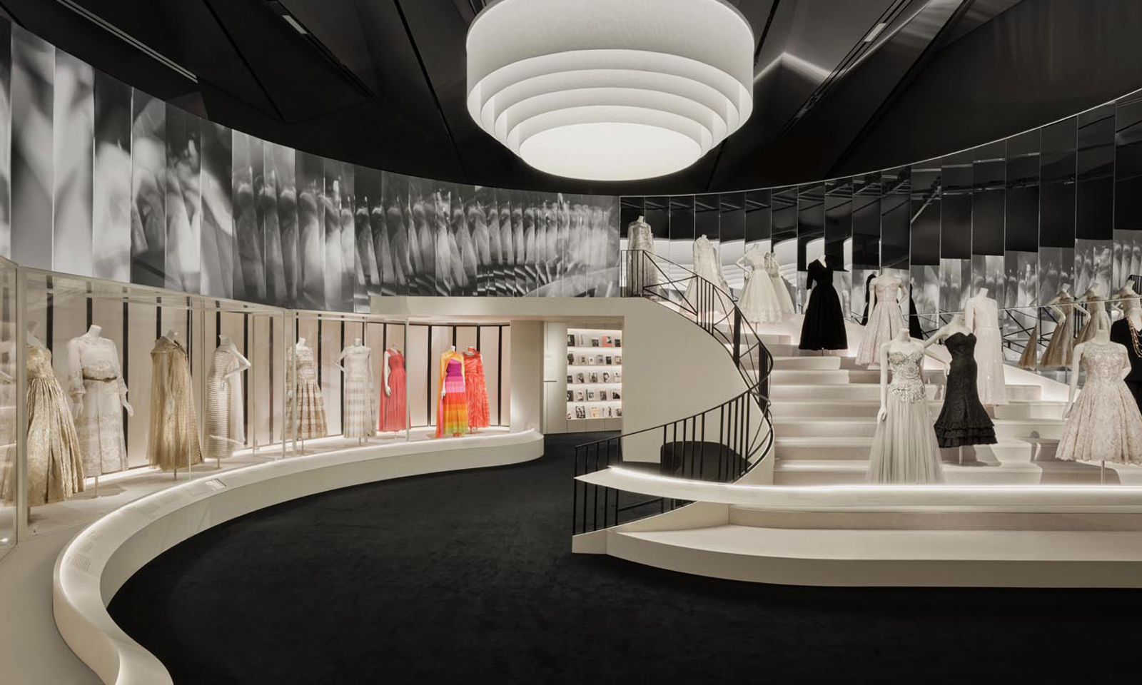 The rotating, glowing light in The Perfume Room, which has its own structure within the exhibition space, is one of the stand-out lighting features in the exhibition, along with the bespoke, abstracted chandelier in the eveningwear area, where the Rue Cambon staircase has also been re-created. Light moves constantly across the stair at the exact tempo of a film, projected onto the panels alongside and above the stair, which features archive footage of Chanel herself.