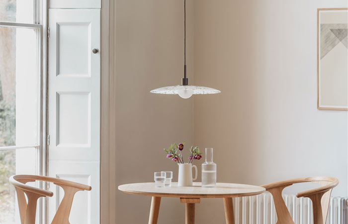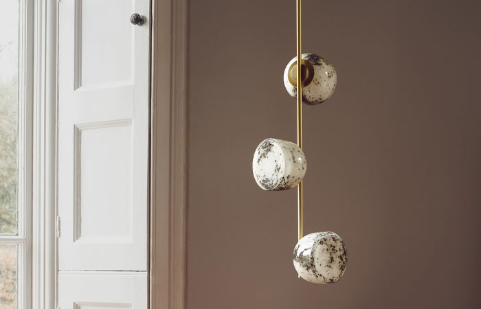 White glass grains disperse naturally across the surfaces of Heathfield’s new Milo and Cosmo pendants, forming irregular patterning unique to every piece. Evoking a sense of serenity, the cloud-like formations captivate, inspiring the imagination to detect individual shapes and outlines. In two considered forms, light diffuses softly though the glass, casting harmonious reflections across their surrounding space.