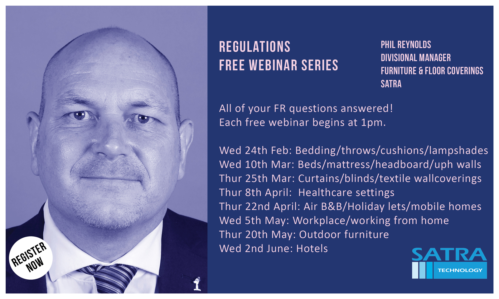 Watch: FR Webinar Series – Bedding/throws/cushions/lampshades Focused discussion on FR requirements in collaboration with SATRA, looking at bedding, throws, cushions and lampshades. 22 March 2021 FR Webinar Series