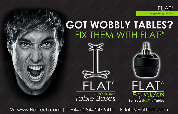 FLAT manufactures a range of self-stabilising table bases for the foodservice and hospitality industries. Our award-winning tables utilise hydraulic technology which adjusts to uneven surfaces automatically. In 2017 we launched FLAT Equalizers. Equalizers stabilize existing wobbly tables, replacing the screw-in feet found underneath tables. Both products save users time and money, whilst improving the customer experience!
