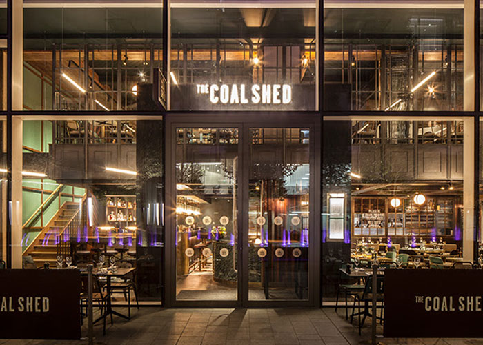 The Coal Shed is housed in a striking double height building with an impressive glazed façade, providing maximum visibility into the inviting restaurant space. On arrival guests are greeted into a warm and atmospheric bar area decorated with soft gantry lighting, aged brass screens and polished chevron flooring. An array of social seating is fixed around the bar, helping to set the overall comfort level and ambience of the space.