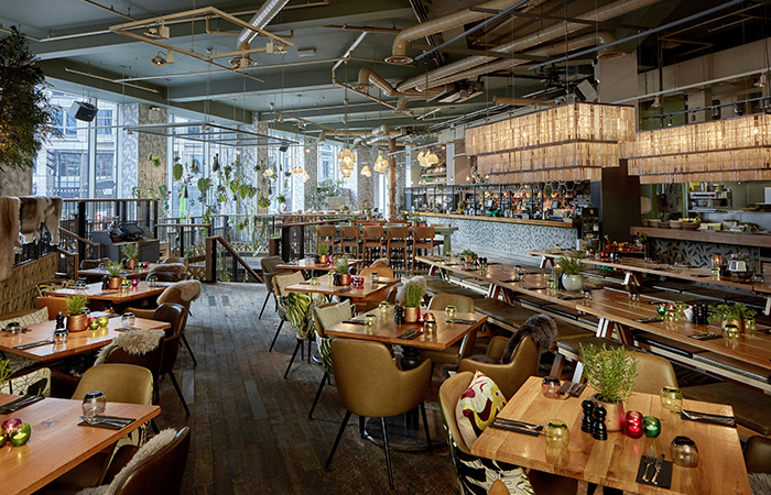 The large scale skeletal leaf pattern in neutral tones and contrasting warm greys features throughout the restaurant. A vast collection of plants enhance the whimsical scheme. Raw wood furniture, stone flooring, fur rugs and garden-themed ephemera are lifted with vibrant magenta, mustard and burnt orange accents.