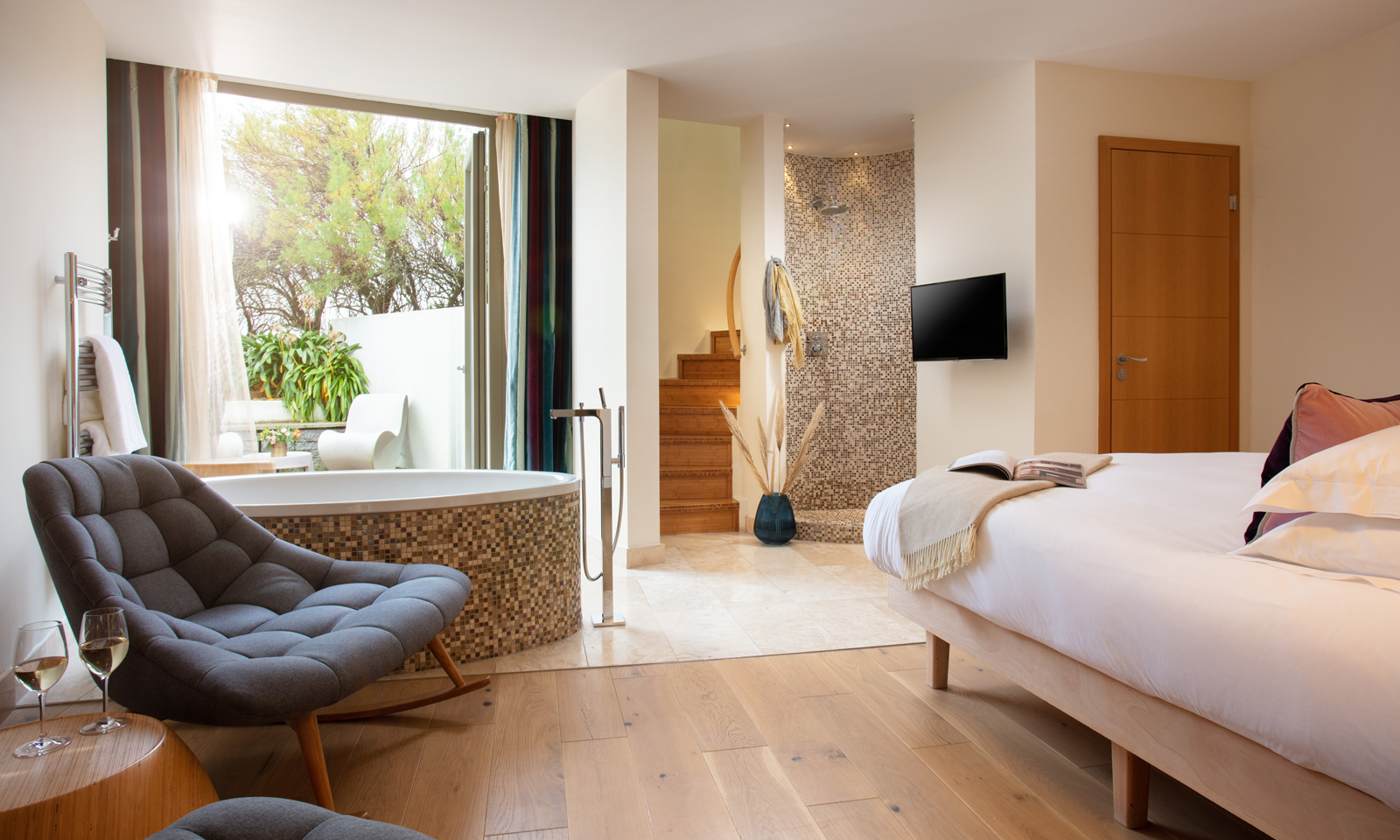 The accommodation cleverly arranged in small clusters, to dissolve the traditional hotel plan of long corridors and form shorter connecting spaces, some curved in design and moulded to the cliff side. The sensuous use of materials and sympathetic interior design offers an unmistakably Cornish fi nish. Guests are assured of a relaxing night’s sleep in their sumptuous Hypnos bed, waking up to views overlooking the beach. Each room has its own balcony and some even boast their own gardens, wrap around terraces and shell-like viewing pods.