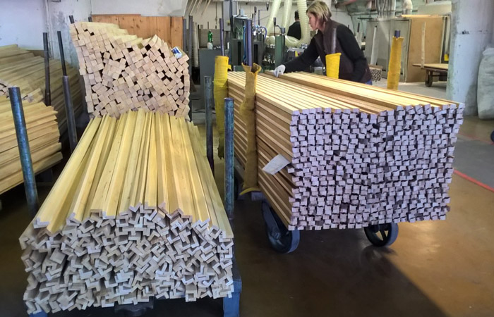 The process starts with the sawing of 60 year-old matured pine trees, with the wood then stored, climatised and taken through the kiln drying process. The timber is sorted, and only the outer edges are used for moulding production. The inner part of the tree is not suitable for the manufacturing of the mouldings.