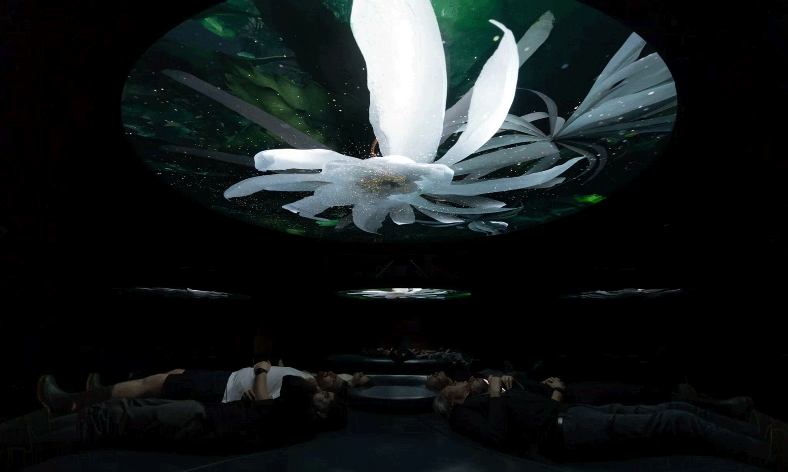Guests step beneath a cascading waterfall into a simulated tropical downpour. Spatial rain sound envelops them. The scent of petrichor rises. Reclined on vibroacoustic lily pads, they gaze up at a projection of the towering kapok tree – the legendary Lupuna – as day cycles into night overhead.
