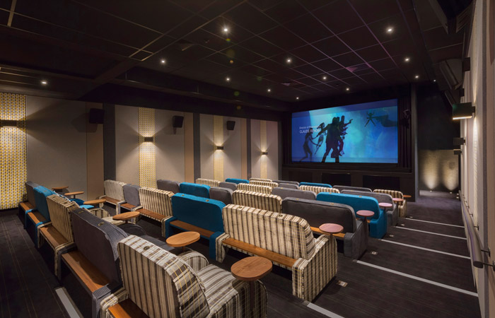 Bespoke armchairs complete with handcrafted tables and drinks shelf in Walnut adorn this luxurious cinema venue
