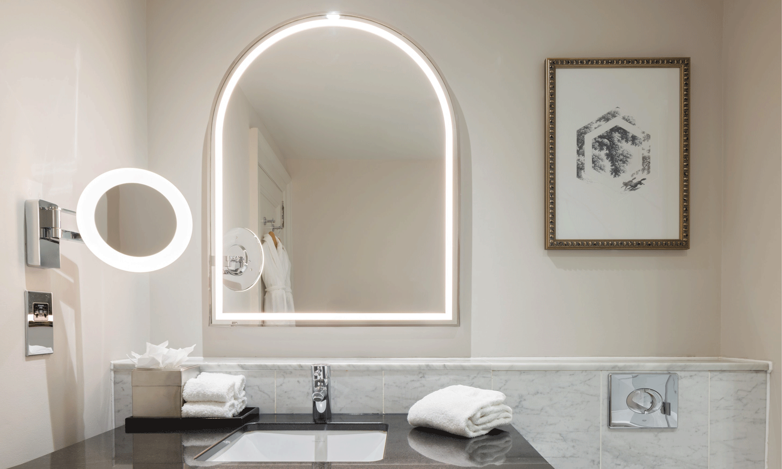 For this distinguished project, Luma Mirrors designed and supplied 246 front-illuminated, anti-fog arch-shaped bathroom mirrors finished in sleek chrome. Dubbed the Chester, this mirror model balances form and function, providing guests with crystal-clear visibility and consistent lighting—regardless of humidity. The arched design introduces softness to the interior palette, while the chrome finish complements the timeless luxury of the hotel’s bathrooms.