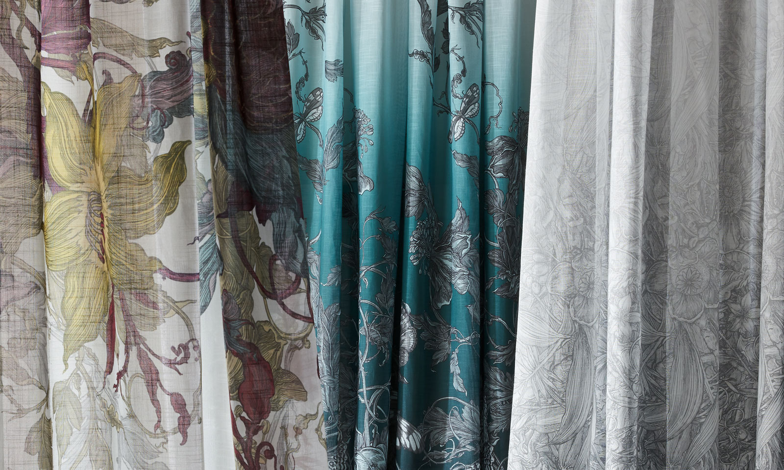 The range also includes the exquisite patterns presented on wide width sheer ombre panels, exploring designs which both trail down and fade upwards.