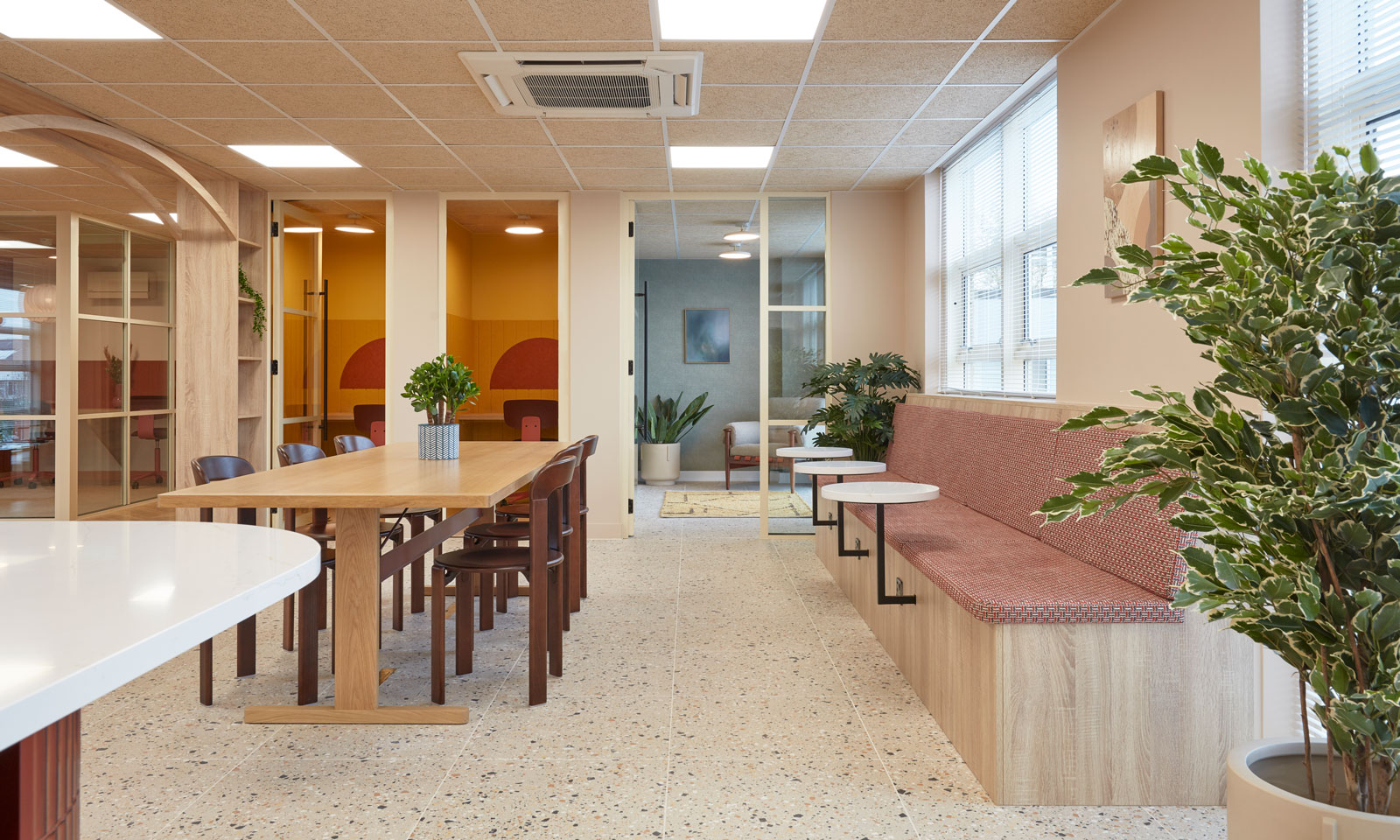 The communal kitchen encourages several scenarios and caters for all. A generous central island which also doubles up as a meeting area, is clad in deep red tiles from Archi-tile and carries a quartz worktop. Hay’s new Passerelle dining table features alongside their classic Rey chairs. A bespoke banquette upholstered in Linwood Harlequin fabric and café-style seats – all speak to a brief which encourages gathering and sharing. Archi-tile Terrazzoprinted porcelain tiles compliments soft, peach-nude walls with handmade marquetry artwork from Chelsea Vivash, sourced through Partnership Editions. Economical, square bright white kitchen tiles are given a clever contrast with burgundy grout and a neon sign provide a nod to the cafe culture from the surrounding area.
