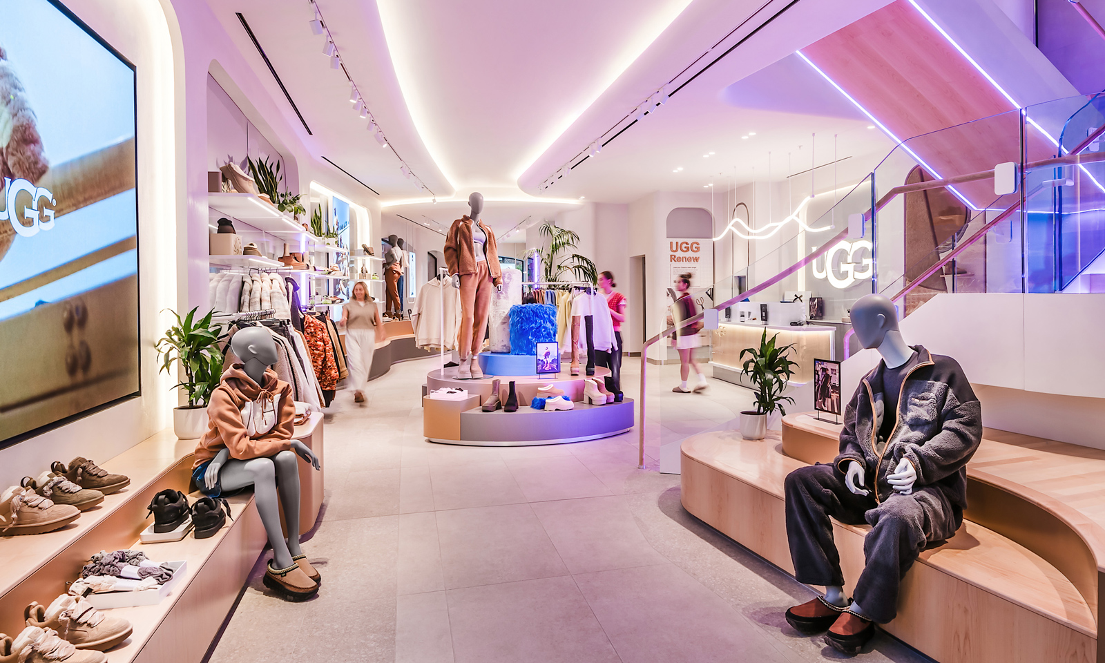 Underpinned by a commitment to inclusivity, the welcoming ambience extends to all aspects of the store, which incorporates a flowing, curvilinear design that promotes tactile comfort and fluid expression, complementing UGG’s products.