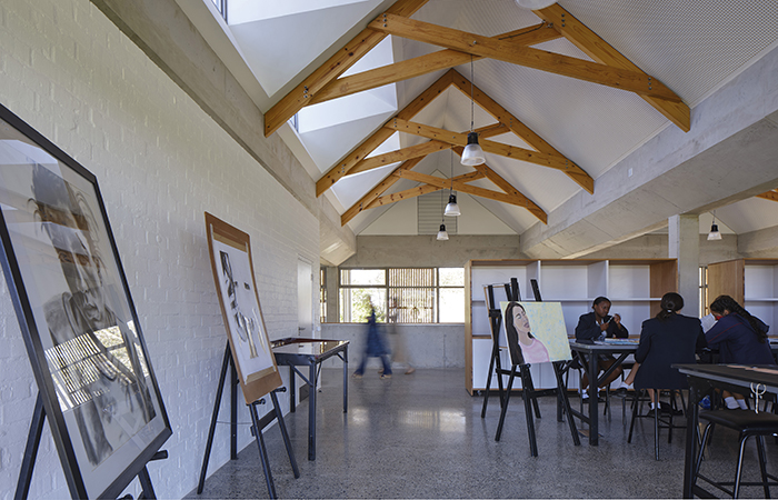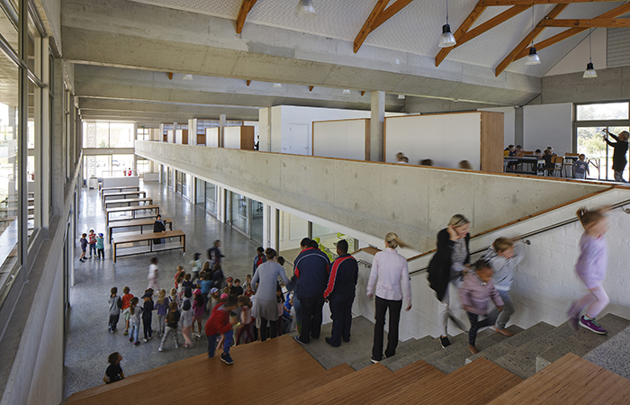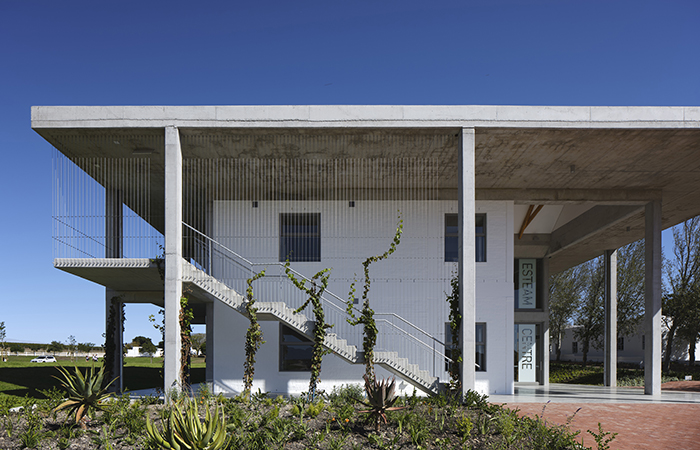 The ESTEAM Centre sits prominently near the entrance, highlighting the school’s pioneering approach to learning and creating new links across the site. Native vines trail up the tension cables on the terrace to ground it in nature and provide shading, while the white walls and dark gable roofs are a contemporary response to the Cape Dutch aesthetic. Its robust materiality and pared-back design respond well to the climate and create an honest building; one that will be used creatively and boldly.