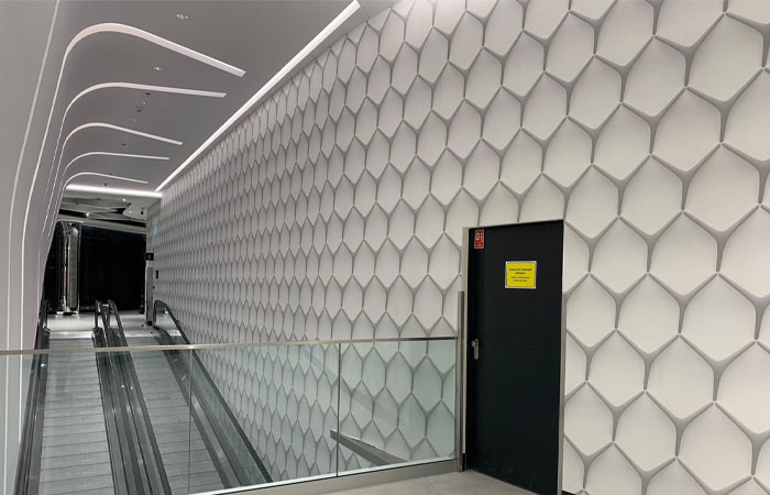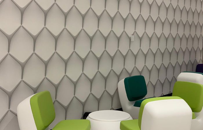 The design was manipulated and manufactured by the exceptional UK Muraspec team to make the motif pop out and enhance the 3D effect on the wall. The shadows were reworked and a gloss white layer created and printed under the structure of the motif. The subtle difference in reflectivity compared to the background provided further depth to the design once installed. Being a vertically integrated manufacturer, Muraspec were able to ensure that each step of the design and production process met the highest standards set by the client.