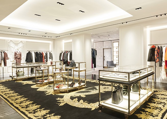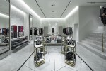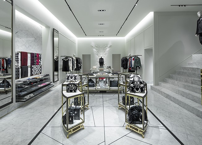 For their Alexander McQueen stores David Collins Studio worked with carpets in nude tones and reds to represent the womenswear and the menswear respectively. The pattern or language within the flooring was inspired by the work of Sarah Burton. The marble floor tiles were smashed and re-set to create a distressed pattern within the flooring in different black or white marbles depending on the store location and design. Lewis explains, “when we implemented the design in the Paris Flagship, we wanted to create something unique that represented the location – so we evolved the design and created a version of Parquet de Versailles that took the form of the smashed and re-set marble floor. Within the same store we used nude carpets and a custom Rug Company Alexander McQueen design Military Brocade rug that is very beautiful and refined and impressive in its size.
