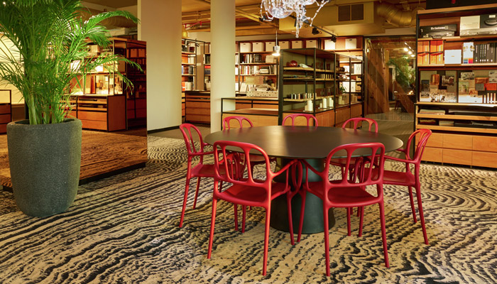 Industrial Landscape by Tom Dixon for Ege Carpets can be seen in the studio area of the office. The carpet itself mimics the movement of water in the River Thames, contrasting against the angular Bolon flooring that references the urban and natural influences of Wilson Associates’ body of work.