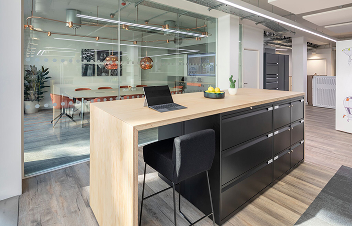 Adding wood elements to steel furniture gives it a visual softness and a more natural feel, which is popular with designers and businesses alike. Lockers, caddies, credenzas and the more traditional storage units and cupboards can all be clad or topped with wood to create warmth or to match with existing design schemes. Lockers with wooden doors are proving particularly popular and clad lockers can elegantly divide workspaces and support branding. Creating extra work spaces is another benefit of combining materials. Thick veneer wraps can be combined with tractional storage to create striking, almost industrial pieces that provide vital agile spaces to stand, sit, work or chat.
