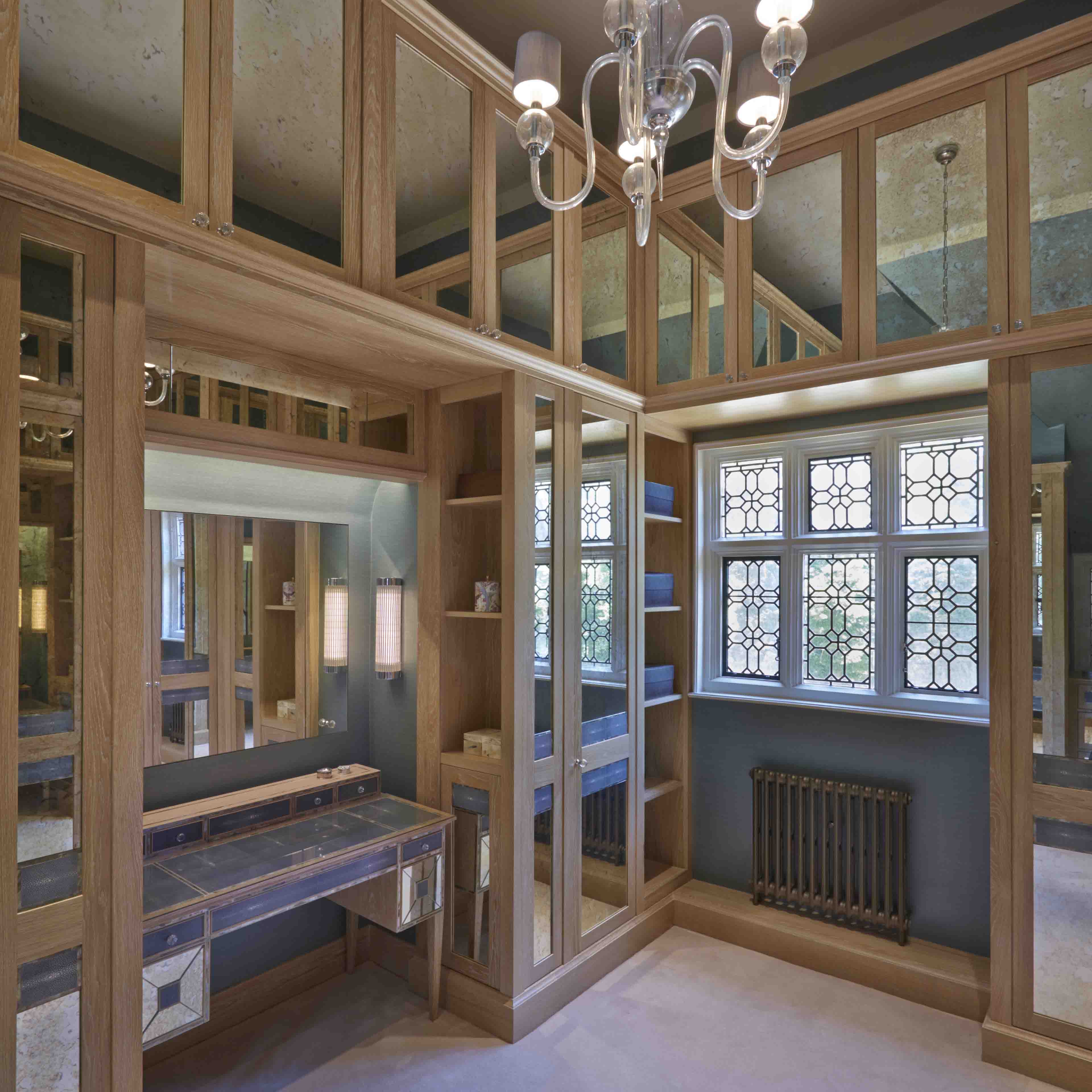 We had the privilege of working on the restoration of a house, originally designed by G E Street, best known for his Gothic-style Law Courts on The Strand, London. Working with Ian Adam Smith and Victoria Fairfax, the room’s design is that of a jewel box and is made from the most exceptional materials – verre eglomise panels, mother-of-pearl shagreen hand-dyed a special denim blue and set into a framework of English oak. The dressing table has a frieze of shagreen and mother-of-pearl with hand-blown and cut-crystal handles. The ability to combine such incredible materials is design ‘alchemy’ and I am passionate about continuing to push the boundaries of old and new materials. My studio is an Aladdin’s Cave of wood and contemporary material samples, which are a huge inspirational source for my design team.