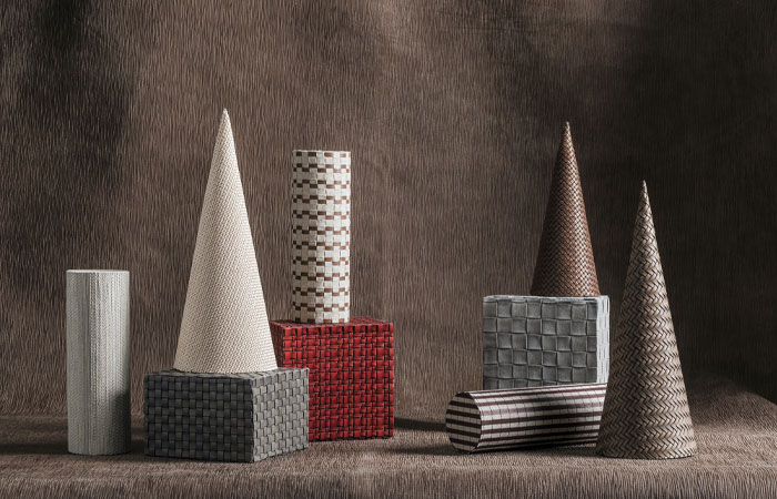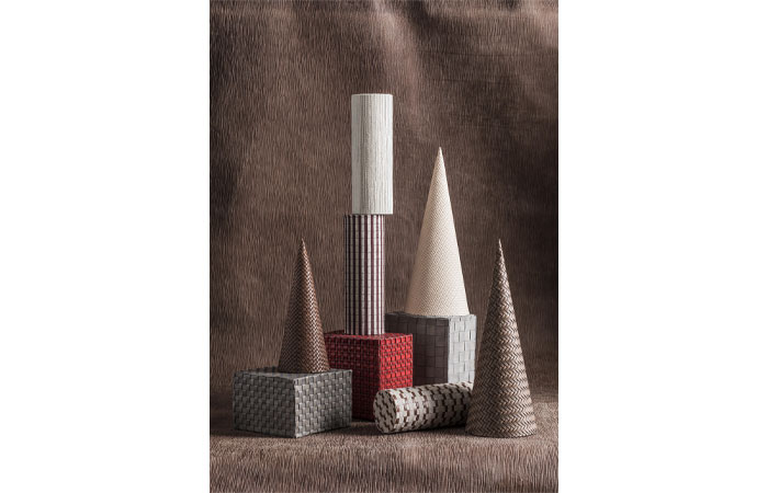 The collection is inspired by the use of woven detailing in couture fashion and luxury accessories and celebrates leather by incorporating secondary materials including faux leathers, grosgrain ribbon, as well as linen into some of the designs. Woven leather is a versatile collection that can be used in countless ways, from upholstery and walling to decorative interior accessories.